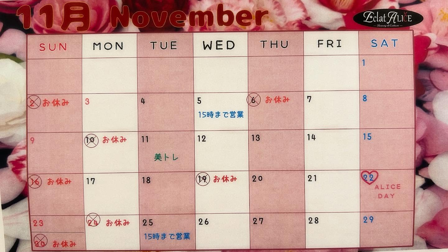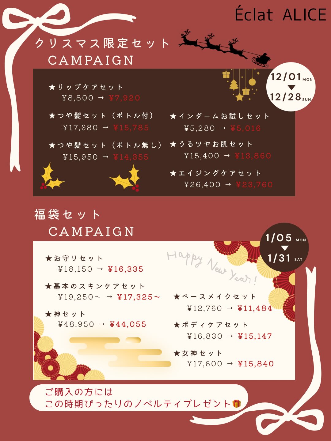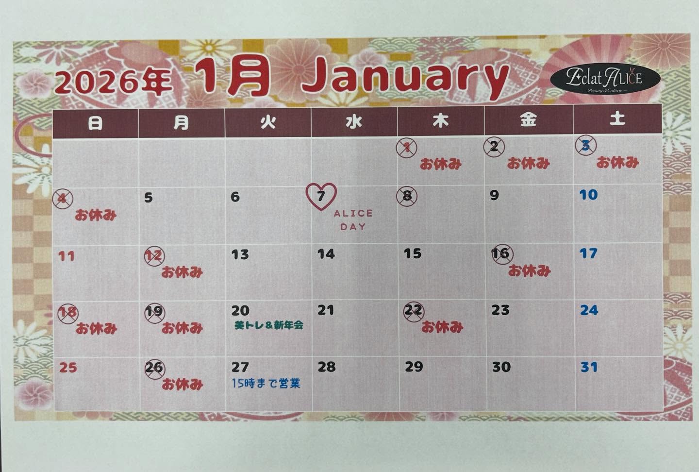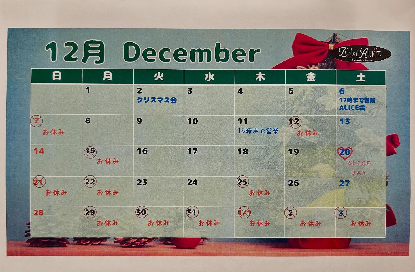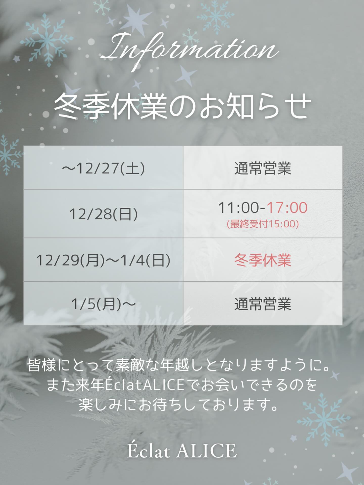 2023年12月29日(金)~2024年1月3日(水) まで休業させていただきます。 2024年1月4日(木)からご予約いただけます。 2024年もÉclat ALICEをよろしくお願いいたします。 |
